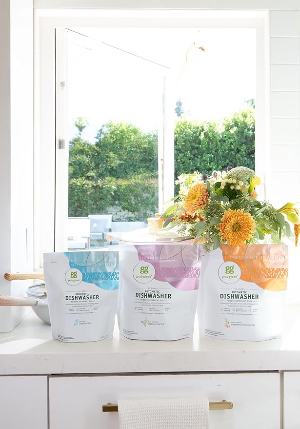 - Contains: 1- 60 Pod Bag of Grab Green Natural Thyme with Fig Leaf Automatic Dishwashing Detergent Pods. Our velcro closure bags are convenient and easy to use, no hassling with frustrating zip closures