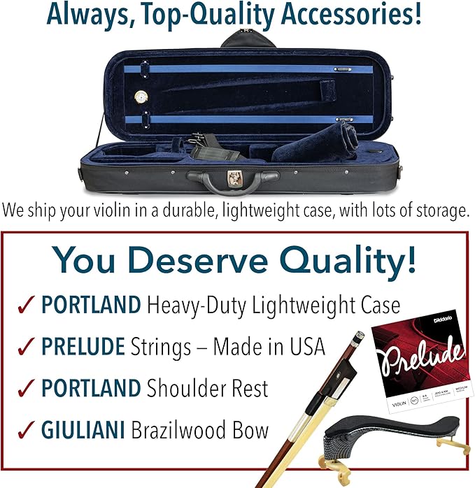 - [THE COMPLETE OUTFIT] We have included the HIGH QUALITY accessories that professional players recommend in your outfit. This includes a Giuliani Brazilwood Bow, Giuliani rosin, D’Addario Prelude strings installed on the violin, a Portland oblong violin case, an extra set of Portland Strings, a Portland Carbon Fiber Shoulder Rest or a contour foam rest for 1/16 to 1/8 fractional instruments.