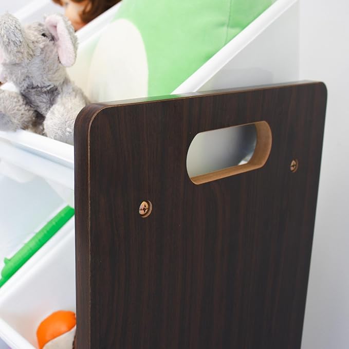 - Durable & Safe Construction – Sturdy engineered wood frame with steel dowels ensures long-lasting strength and stability; bins are BPA- and phthalate-free for added safety.