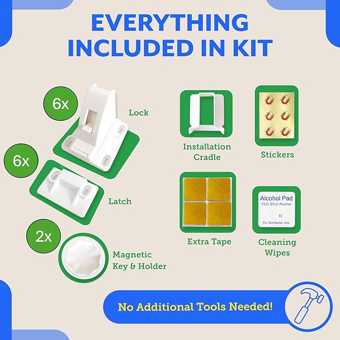 - Complete Child Proofing Kit: Take baby safety to the next level with our comprehensive kit, which includes 6 magnetic cabinet locks, 2 keys, an installation cradle, a measuring ruler, and extra 3M adhesive tape.