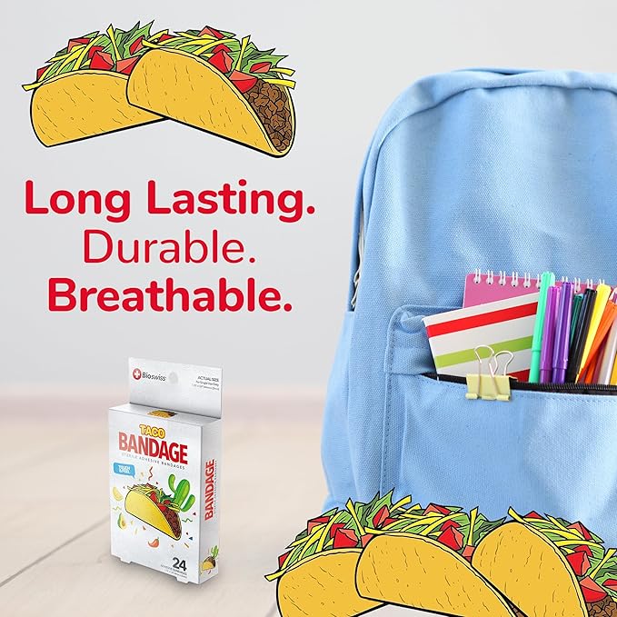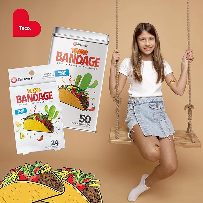 - TACO BANDAGES: This 24 piece pack of adorable and delicious looking taco bandages is great for putting a smile on kids' faces while protecting wounds such as cuts, scrapes, and burns; sticky bandages are perfect for kids and adults alike, and also for school nurses and pediatric doctors