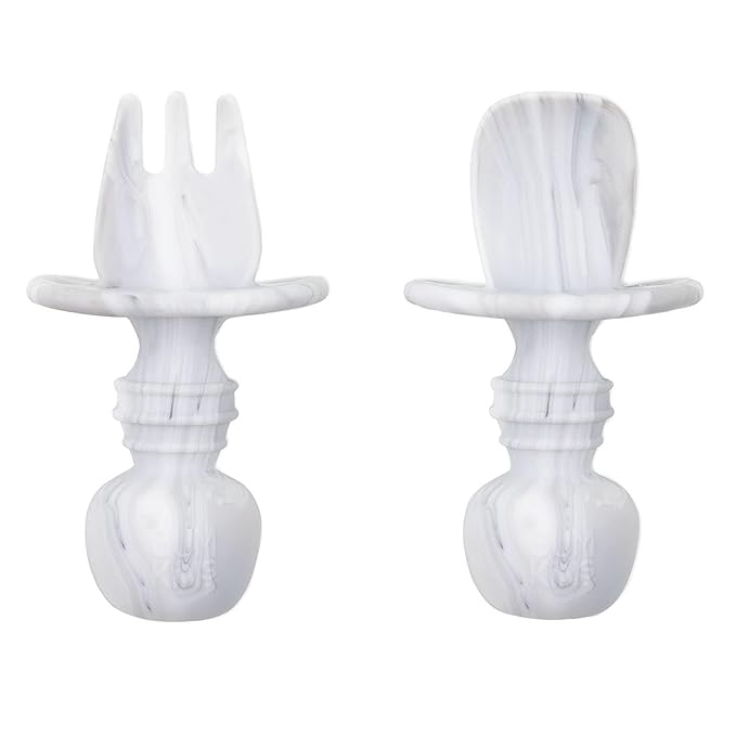 Bumkins Baby Utensils Set, Chewtensils Silicone Spoons for Dipping, Self-Feeding, Baby Led Weaning, Trainer Learning, First Stage Eating, Soft Practice Fork and Spoon, Babies 6 Months, Marble