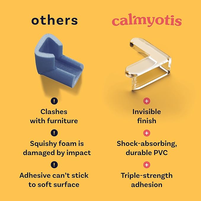 - Optimal Density: Other corner protectors are made from too-soft silicone or foam, marketed as being desirably “squishy”. But adhesives don’t stick well to soft materials, so little hands can tug them off easily. Our premium PVC protects while softer alternatives can dent inwards or flake off over time.