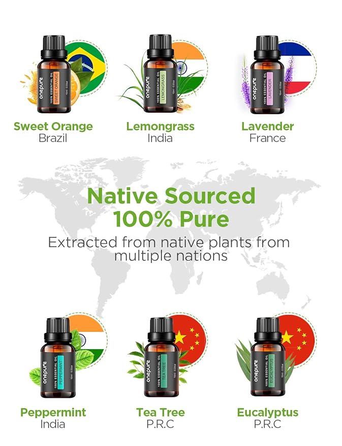 - Native Sourced, Bottled in the USA, 100% Pure: 6 scents include tea tree, lavender, eucalyptus, lemongrass, peppermint and sweet orange, which are extracted from native plants from multiple countries. With premium quality, each drop is 100% pure with no additives, fillers, bases or carriers added.