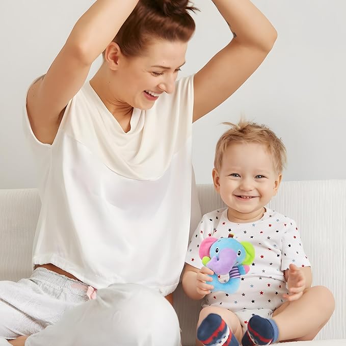- CUTE DESIGN -- Lovely animal image design,the ears of elephant and the wing of owl were with sound paper, encourage baby to reach and grab.The Soft rattles have bells inside, it make āling,ling...ā sounds when shaking the dolls.