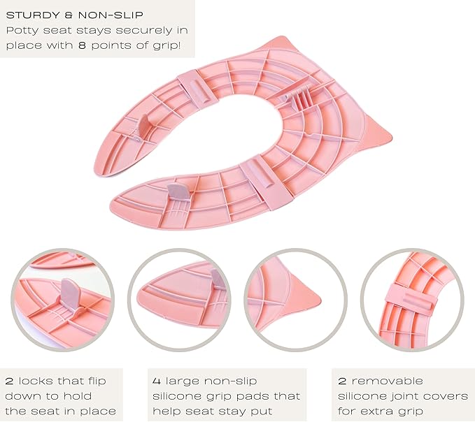 - ✔️ STURDY & NON-SLIP: The potty seat has 8 points of grip that help it stay securely in place. It includes 4 non-slip silicone grip pads under the ears and bottom ends and 2 locks that flip down to help the seat stay put and keep it from sliding. The 2 removable silicone joint covers also help to add more grip in the center of the seat, making it extra sturdy!