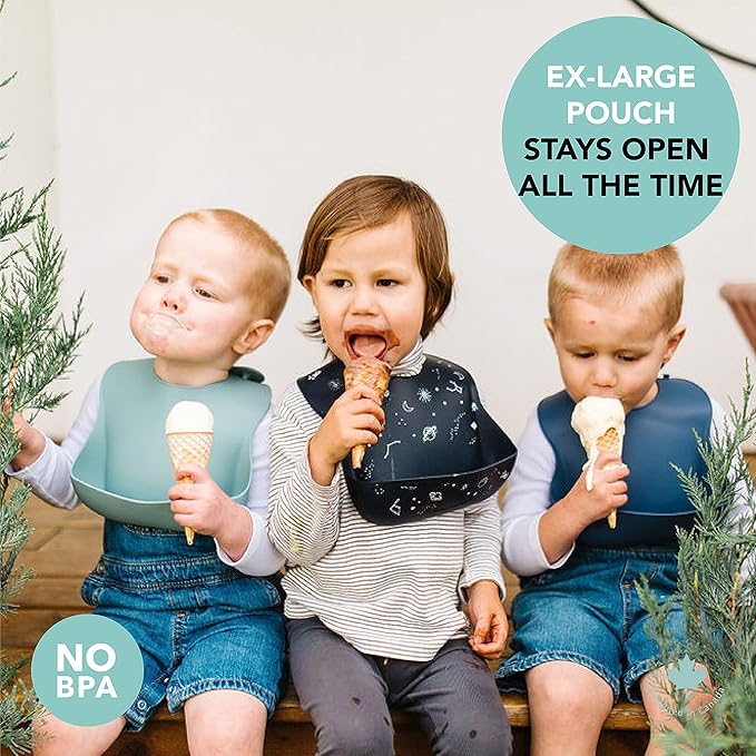 - TRAVEL FRIENDLY AND ADJUSTABLE FIT - Our flexible silicone bib is simple to roll up and pack for on the go! Plus reinforced, durable buttonholes adjust to fit your growing baby, ages 3 - 36 months.