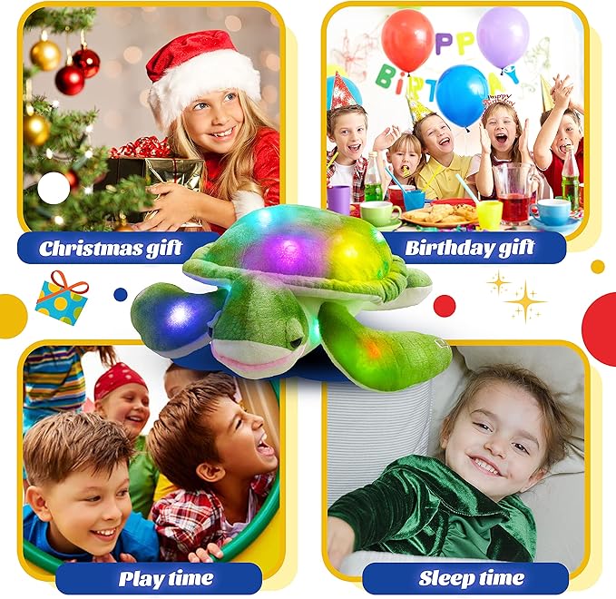 - Adorable Turtle Design – This adorable plush toy features a green turtle design. The colorful light-up tortoise makes a great playmate for both day and night. It's a great gift for children and loved ones for Christmas, Children's Day, Valentine's Day, birthdays, or any other special occasion.