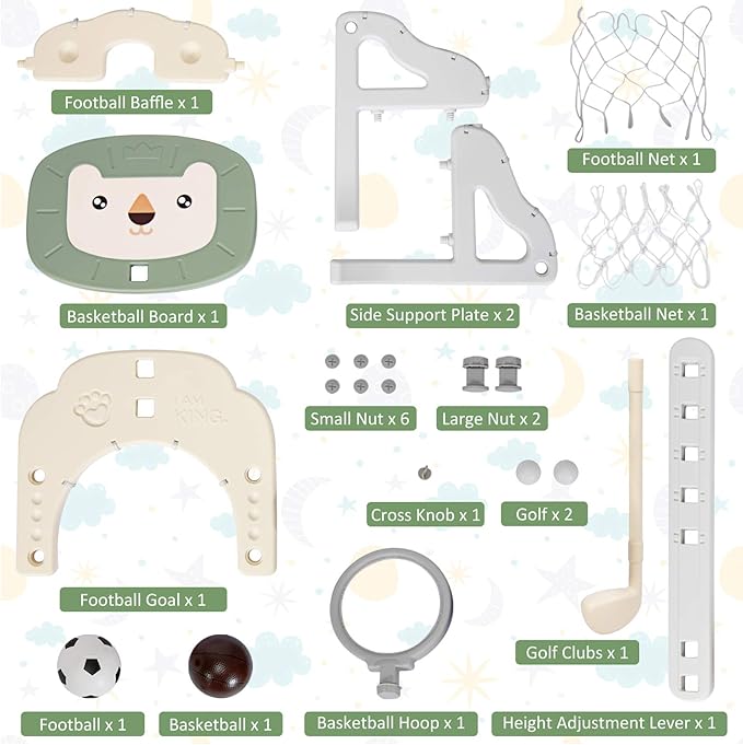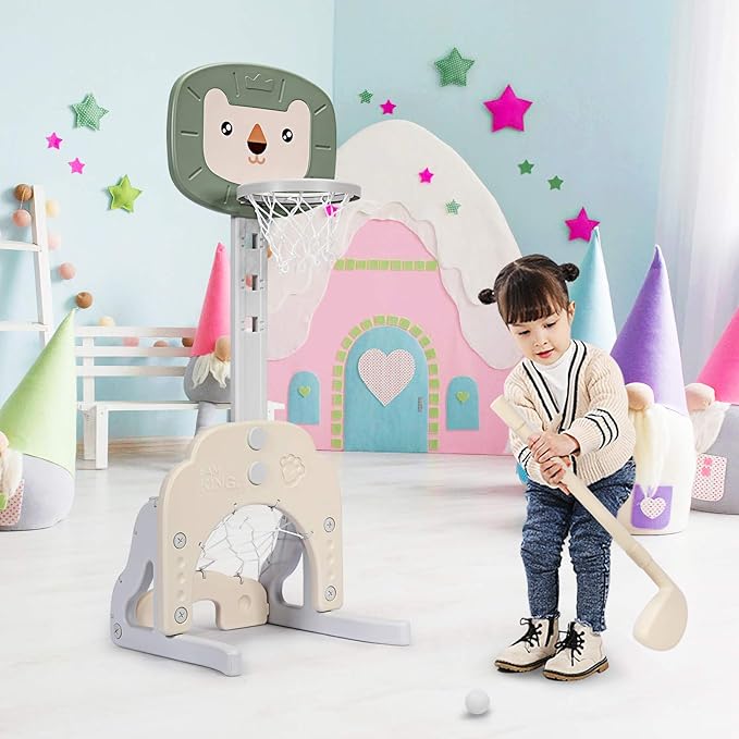 - 【3-in-1 Activity Center】 This kids basketball hoop has three sports to play, including golf game, basketball game and soccer goal game. It also comes with 1 basketball,1 soccer ball,2 golf balls and 1 golf club. By playing by themselves or with friends, children can gain unlimited joy and develop motor skills!
