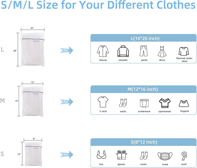 - S,M,L size for your washing need: You will receive one 8 x 12 in, one 12 x 16 in, one 16 x 20 in delicates wash bag made of high-quality material for a long-lasting usage to protect your jeans, sweater, kids baby clothes, pants and etc