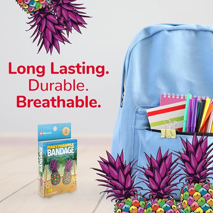 - FUNKY PINEAPPLE BANDAGES: This 24 piece pack of adorable and delicious looking tropical pineapple bandages is great for putting a smile on kids' faces while protecting wounds such as cuts, scrapes, and burns; sticky bandages are perfect for kids and adults alike, and also for school nurses and pediatric doctors