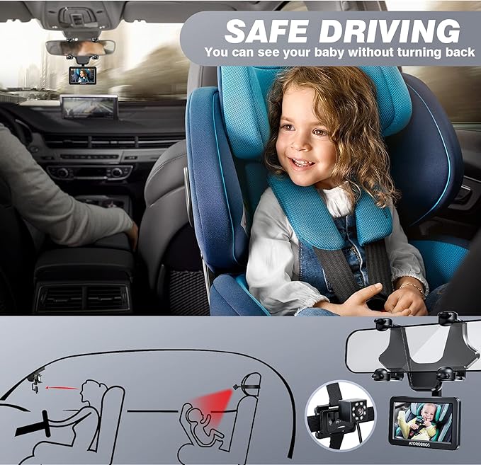 - 【EASY INSTALLATION】- Easily mount baby car mirror to the headrest in minutes; no tools needed, install the LCD monitor under the rearview mirror, plug the power cord to the cigarette lighter, then it will work. the LCD monitor will automatically turn on and switch to the baby back seat. the 12V cigarette lighter is suitable for most models of cars. If the accessories are missing, please contact us in time. ATOROBROS will provide 24-hour spare parts service