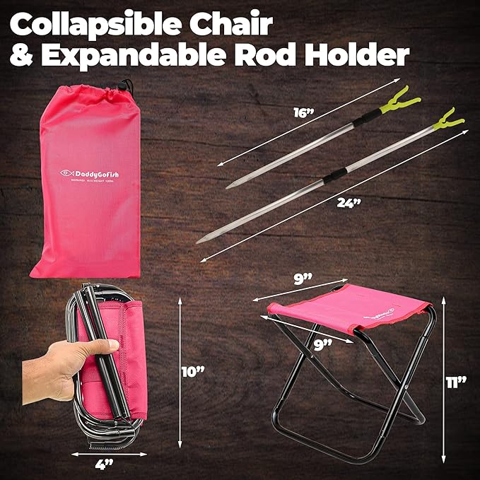 - COLLAPSIBLE CHAIR AND ROD HOLDER - Kids have a place to rest wherever they go. The rod holder keeps the fishing pole off the ground and minimizes the chance of accidental damage.