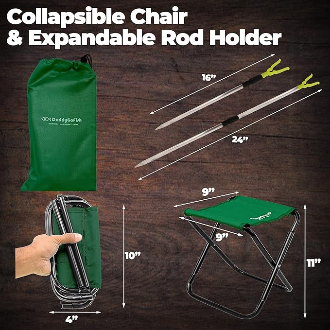 - COLLAPSIBLE CHAIR AND ROD HOLDER - Kids have a place to rest wherever they go. The rod holder keeps the fishing pole off the ground and minimizes the chance of accidental damage.