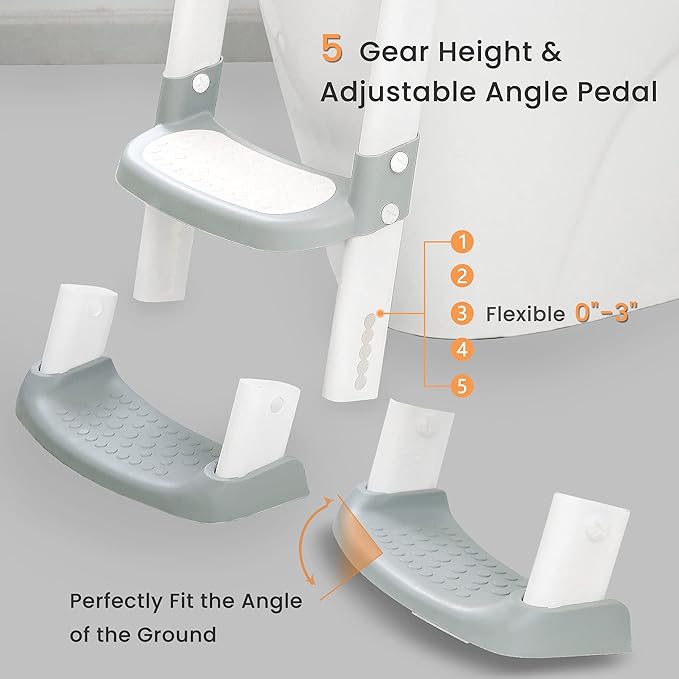 - 【STABLE & ANTI-SLIP】 - The mat made of TPE material of our potty training toilet with step stool can effectively prevent children from shaking or slipping when they turn around and sit down. The 4 rubber strips attached to the first floor pedal are firmly attached to the ground to prevent movement.