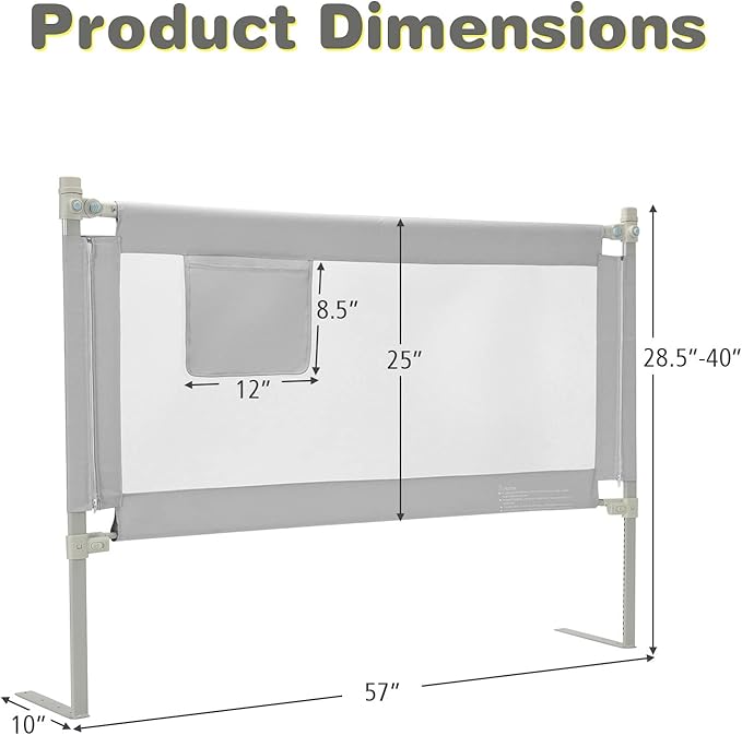 - [ Safe Bedrail with Storage Pocket ]: Measuring 57” x 28.5” (L x H), this long bed rail effectively protects children, especially active babies, from falling out of the bed. In addition, the side pocket can be used to store baby’s daily utensils, such as nursing bottles, toys and diapers.