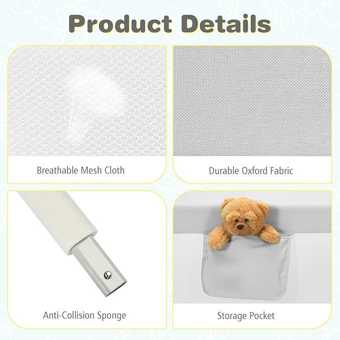 - [ Kids-friendly Material with Safety Ensured ]: The frame of bed rail is made of sturdy steel and wrapped with anti-collision cotton & premium oxford cloth, which ensures excellent stability, safety and durability. What’s more, the breathable mesh keeps good air circulation and is convenient for parents to observe children. By the way, the cloth is easy to remove for daily cleaning.