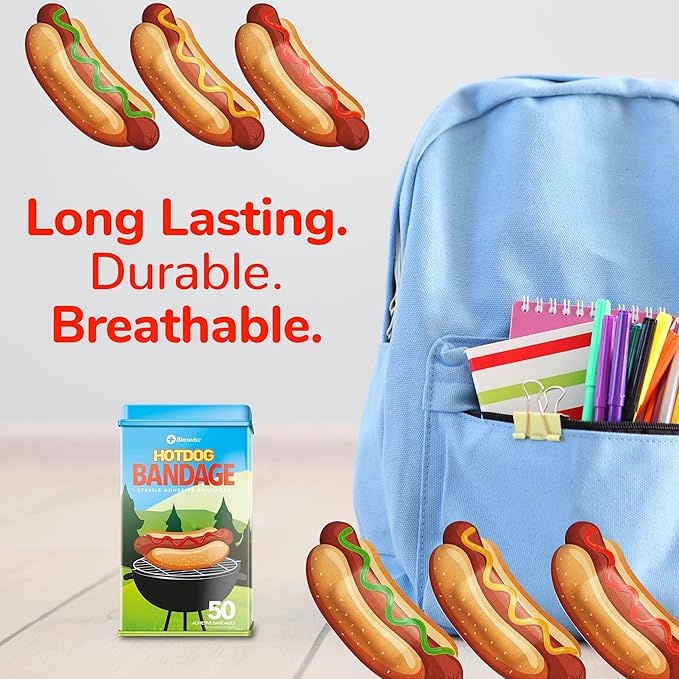 - HOT DOG BANDAGES: This 50 piece tin of adorable and delicious looking hot dog bandages is great for putting a smile on kids' faces while protecting wounds such as cuts, scrapes, and burns, and come in 4 assorted styles; sticky bandages are perfect for kids and adults alike, and also for school nurses and pediatric doctors
