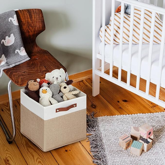 - 【Premium Material】The fabric storage cubes used in the 13 inch cube storage bins for shelves is fashionable and breathable, sturdy, breathable fabric materials with no peculiar smell, and the cardboard inside is strong and easy to fold. These fabric storage cubes are sturdy enough to hold your stuff well. The leather handle is durable and easy to carry. The foldable storage cubes for organization are easy to clean, If foldable cubby storage bins is dirty, wipe cubby storage bins with a cloth