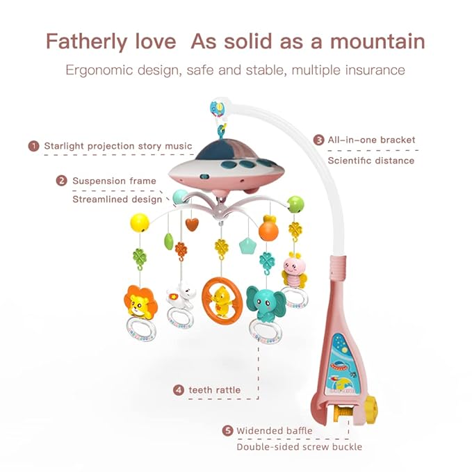 - Safe Crib Toy - Crib mobile is made of safe ABS material, BPA free. The crib mobile is designed to be as safe and stable as a fatherly love. Its bracket spacing science. Its suspension frame has a streamlined design. The baffle is widened and double-sided turnbuckles can prevent slipping and falling off. These provide a variety of insurances for the safety of the baby.