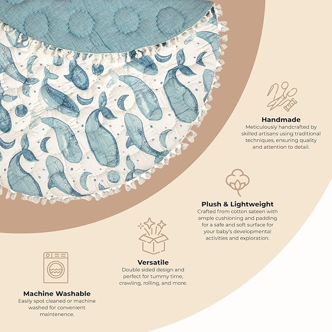 - STIMULATING: Stimulate your baby's visual senses and cognitive development with this playmat, designed with an engaging whale print. Perfect for tummy time and floor activities, this mat adds a playful touch to your nursery decor.