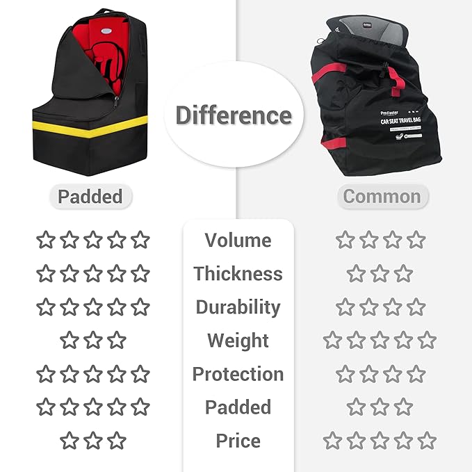- Superior Material: ProFaster padded carseat travel bag is made of durable Oxford polyester with double-stitched, which is Water-Resistance, tear-resistant, light weight and strong enough for long-term use. Never worry about the safety of your experience carseat.