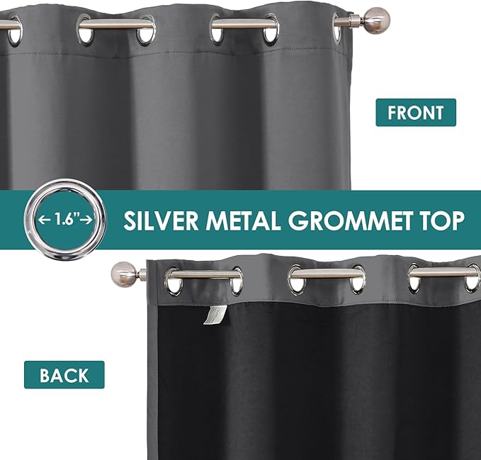 - SET DETAILS: Set of 2 gray total blackout curtain panels per package. Each lined curtain measures 42 inch wide by 54 inch long with 6 silver metal grommets (1.6 inch inner diameter) on top, easy to install and slide.