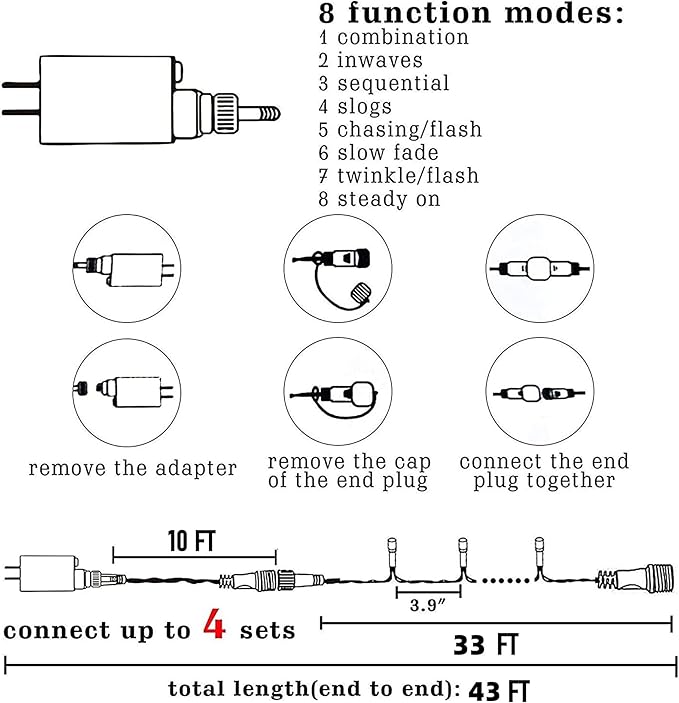 - 8 Lighting Modes Christmas Lights: 8 Modes (combination, in wave, sequential, slo-glo, chasing/flash, slow fade, twinkle/flash, and steady on). You could use different modes of the 100 LED lights according to different occasions, light up a unique outdoor & indoor illuminated backdrop for your vivid and funny decorations.
