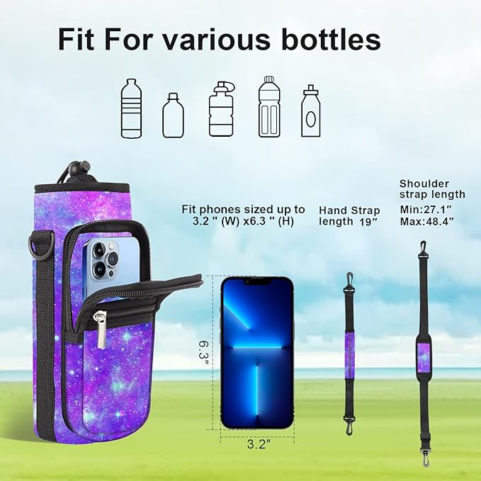 - 【Size】: Our AORTDES water bottle crossbody bag has 4 sizes to choose. 25oz (Max Bottle Diameter 8.2cm ≈ 3.23", Height 23cm ≈ 9.05", Pockets Size 7.48" x 3.93" x 1.57"). 32oz (Max Bottle Diameter 9.7cm ≈ 3.82", Height 20cm ≈ 7.87", Pockets Size 7.48" x 3.93" x 1.57"). 40oz (Max Bottle Diameter 9.7cm ≈ 3.82", Height 23cm ≈ 9.05", Pockets Size 7.48" x 3.93" x 1.57"). 64oz (Max Bottle Diameter 13cm ≈ 5.12", Height 23cm ≈ 9.05", Pockets Size 7.48" x 3.93" x 1.57").