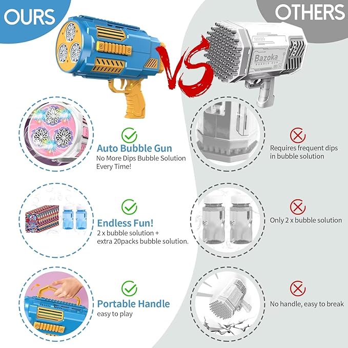 - EASY TO USE- The bubble machine has colorful lights, just pull the trigger instantly and the bubble gun will fire a burst of colorful bubbles, which is very dreamlike and amazing. Create a wonderful atmosphere with ease. More joy for you and your family. When you are tired of playing, the bubble machine can be used as a small fan to bring cool and comfortable wind.Start your bubble journey!