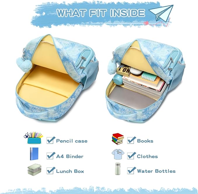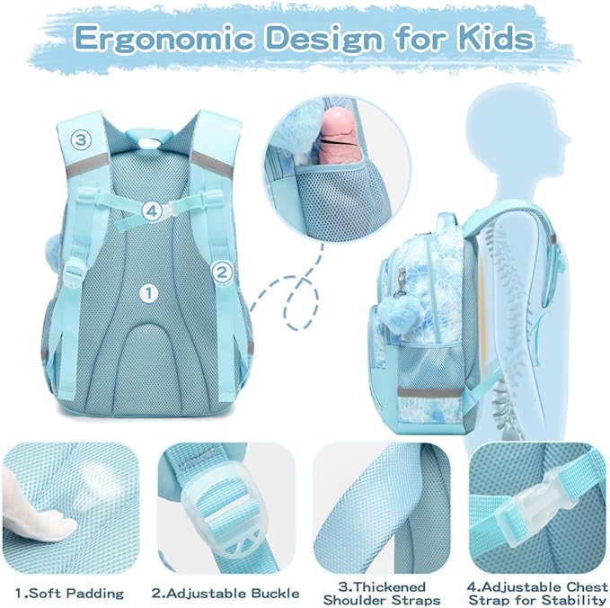- Elementary school students LIGHTWEIGHT DESIGN Backpack - This blue Cute backpack is ideal for kindergarten and elementary school children and has been developed with their comfort in mind. The thickened and widened shoulder straps help to distribute weight evenly and reduce pressure on the shoulders. The backpack's breathable, padded back panel ensures comfortable carrying, while the top handle offers additional carrying options.