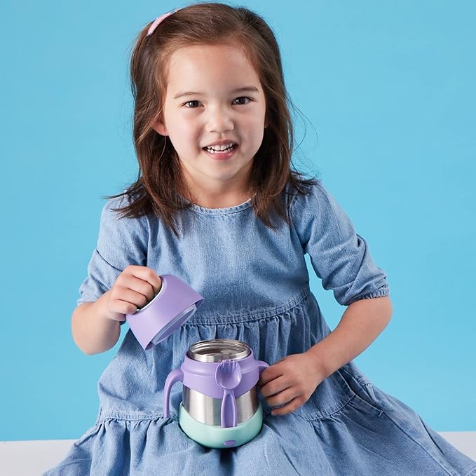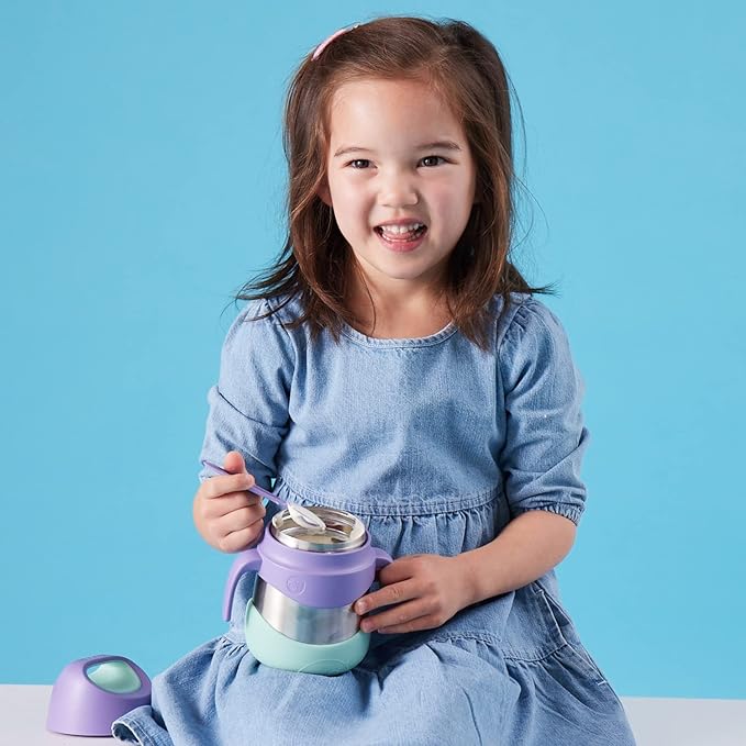 - KIDS CAN OPEN ON THEIR OWN: Designed for pre-school kids, the jar features handles that kids can grip and leverage when opening. Also features a unique stop lock design so adults can't overtighten the lid. Spork (included) tucks away into the bumper!