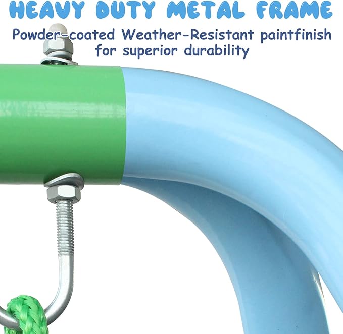 - 【Strong Construction】: The swing frame is made of sturdy iron tubes, all tubes are powder coated, waterproof and rust-proof, and can withstand any weather, so your baby can play on the grass, in the park, anywhere you like! The 4 ground pegs included with the swing set can keep the swing stable and reliable when inserted into the ground