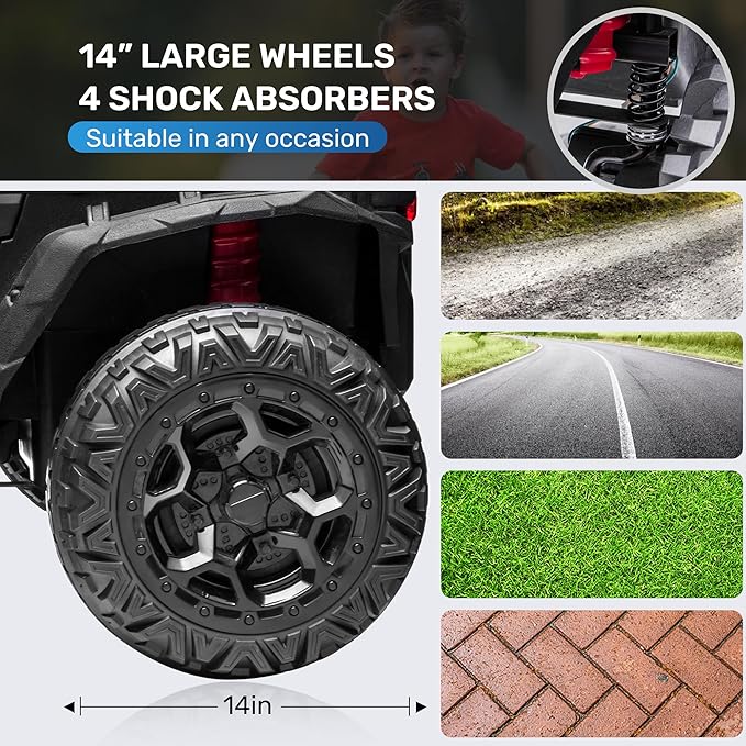 - SAFE DRIVING WITHOUT WORRY: The remote control can override the manual mode, just press the P button to activate emergency braking when there is any potential danger; 4 anti-skid wheels with spring suspensions ensure smooth driving; the key-start and the soft start design, the lockable doors on both sides, all ensure driving safety and protecting children in all aspects