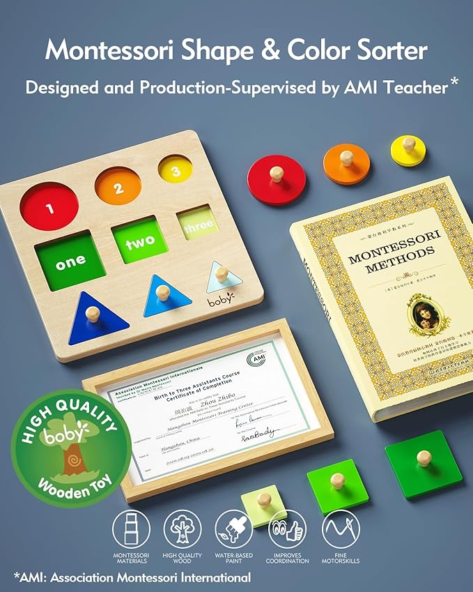 Boby Montessori Puzzles for Babies 12-18-24 Months, Wooden Jumbo Knob Peg Puzzle Shape sorter for Toddlers 1-3 Year Old, Early Learning Sensorial Toys (Shapes & Size Sorting Puzzle)