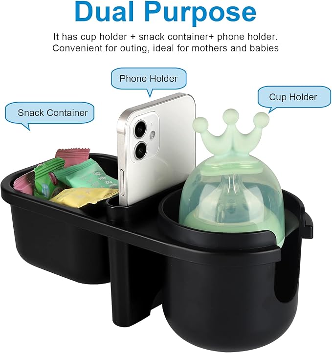 - The 3 in 1 multifunctional holder includes a snack catcher, drink holder and phone holder for snacks on the go. Ideal for mom and baby.