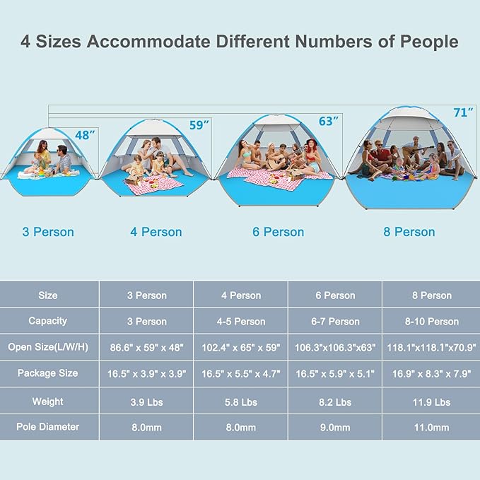 - Super Large Space: Size of 102.4"L x65"W x 59"H, 30% bigger than other POP-UP tent at similar price, fits 4-5 person. It provides a comfortable space for family and friends on the beach