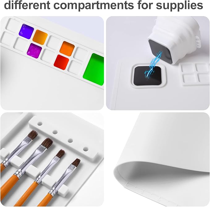 - [UNIQUE DESIGN] - Silicone painting mat has a collapsible attached cup with brush holders on the side and top, built-in paint wells, and brush rests. Keep clean while creating efficiently.