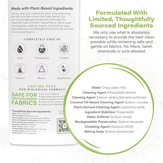 - Specially Formulated: Gently and effectively clean your clothing, lingerie, bedding, and more. Our eco-friendly laundry detergent is perfect for all your protein-based fabrics; silk, wool, cashmere, alpaca, camel, llama, washable furs, and more. Made with plant-based ingredients, this detergent is pH neutral, and safe for skin and fabrics.