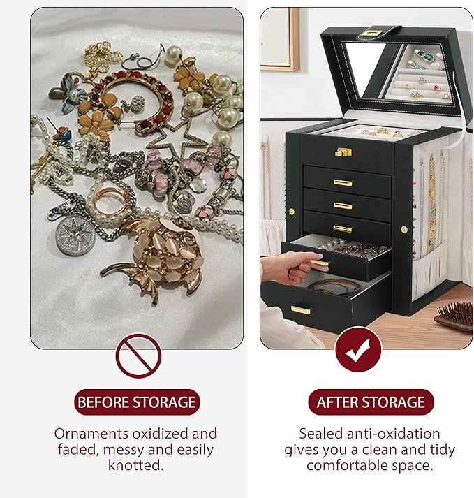 - LARGE CAPACITY, With 6 versatile pull out drawers, this black jewelry box can store a lot of jewelry accessories, such as rings, earrings, necklaces, chains, bracelets, and so on. Soft pillows in the bottom drawer suit for storing watches. One deeper drawer is designed for large jewelries