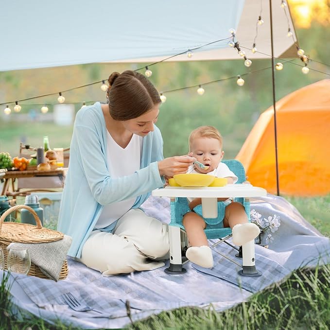 Baby Travel Booster Seat with Double Tray, BabyBond Upgraded Toddler Portable Baby Chair, Booster Seat for Dining Table, Stable and Foldable Booster Baby Chair for Indoor/Outdoor (Blue Sea World)