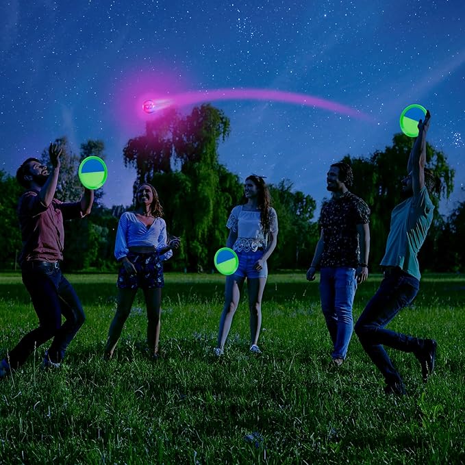 - Upgraded Kids Outdoor Toys - Our toss and catch game set includes two thicken waterproof enlarged paddles, a regular waterproof ball and an unique light-up ball with flashing lights which is perfect for playing in the yard at night