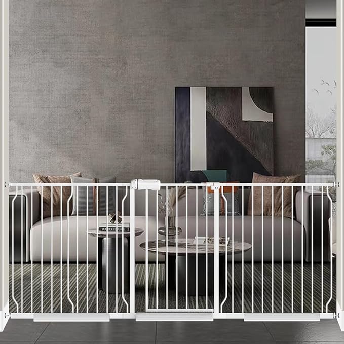 - ADJUSTABLE: Our pet gate can be expanded to fit 85.8-90.5 inches wide openings. This walk thru gate with 19.6 inches swing door makes mothers easier to walk through while holding a baby. Stands 30 inches tall. Reminder: Please measure before purchasing to ensure proper fit