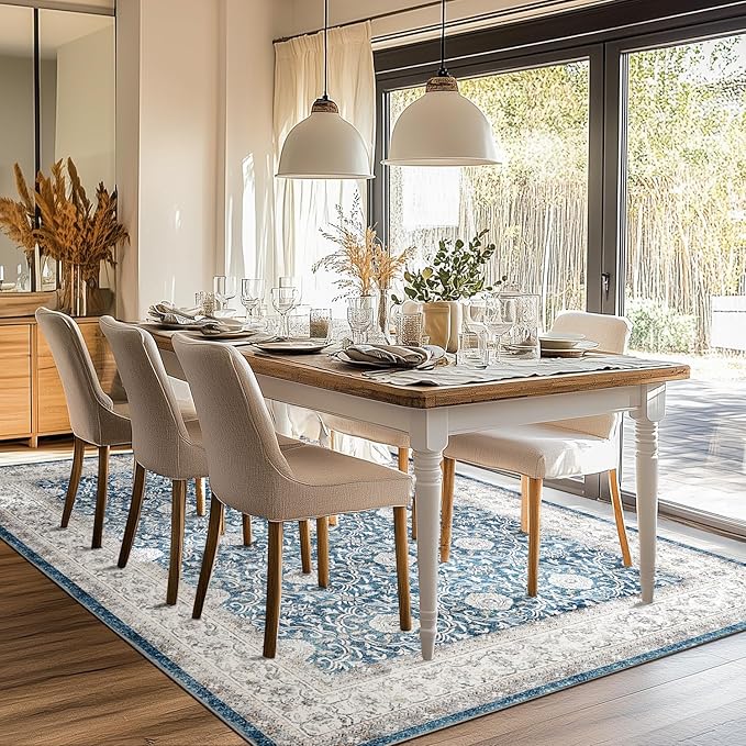 jinchan Floral 6x9 Area Rugs for Living Room - Machine Washable Vintage Distressed Boho Design Throw Rug Stain Resistant Carpet Low-Pile Thin Non-Slip for Bedroom Dining Room Nursery (6‘x9',Dark Blue)