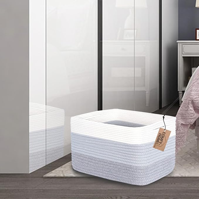COMFY-HOMI Cotton Rope Woven Basket with Handles for Shelves,Toys,Book, Cloth Storage Baskets Bin for Organizing-13.5"x11"x9.5" Toy Decorative Organizer for Living Room, Bathroom-White/3Tone Grey