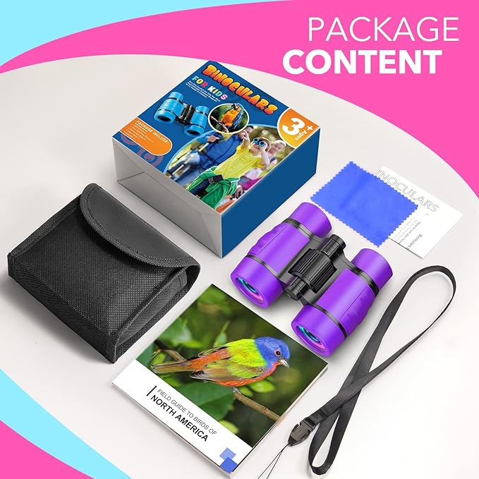 - Adventure Accessories: This fun binoculars is a perfect tool for your kid's outdoor adventure! Package Includs 1x 4x30 Binoculars, 1x Bird Watching Manual, 1x Carrying Canvas Bag, 1x Neck Strap, 1x Lens Wiping Cloth