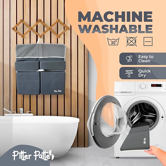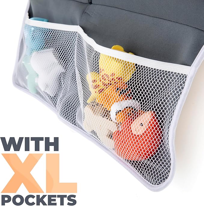 - [Extra-Large Foam Pad with XL Capacity Pockets] - This XL kneeling pad for bathing baby measures 22.2â x 11.3â which is longer and wider than most. Two 9" deep front pockets offer ample space for storing baby essentials for bathtime like shampoos, soaps, toys, and more. Two 6" deep back pockets offer bath toy organizer for tub so your toddler can play. Our baby knee pads and elbow rest pad will keep everything you need within arm's reach.