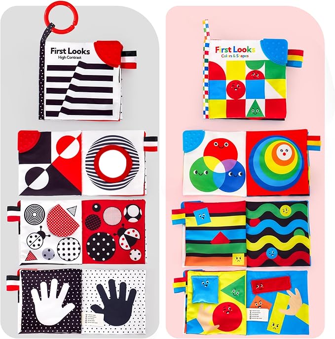 - Baby Books 2pcs for Infants - Ignite your little one's visual development with our 2pcs baby books set, featuring high-contrast black/ white/red patterns(book I), progressing to basic colors with shapes and emotion patterns(book II). It provides excellent visual stimulation, supportingbrain development from the very start