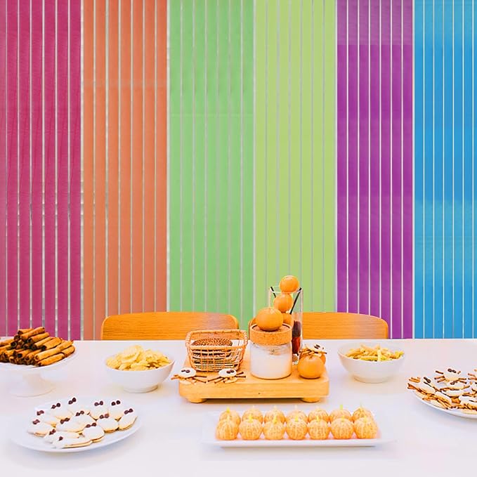- Ideal Size and Bright Colors: Package contains 6 rolls of large sized crepe paper streamers in 6 colors of green, orange, yellow, pink,blue,purple.They are Neon Colors under normal light, but glow under black light. 600 feet/Each roll measures approx. 1.6 inches in width and 100 ft in length. Ideal Size for neon Party supplies.