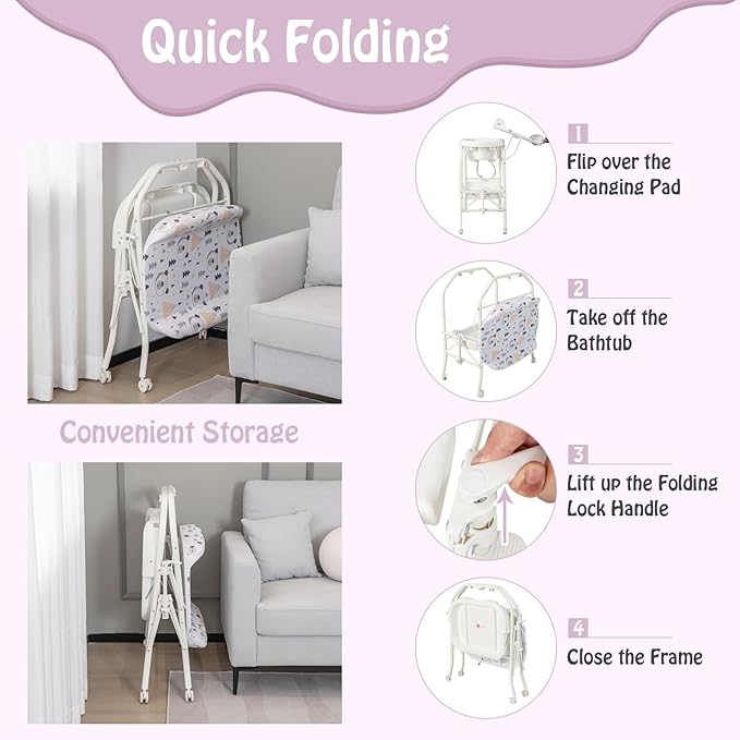 - 4-in-1 Baby Changing Table: This baby changing table with bathtub features a 4-in-1 design for versatility. You can use it to change diapers or clothes for your baby, let your baby take a shower, massage and nurse your baby, as well as hold baby essentials. And the height is appropriate so that you do not need to bend too much.
